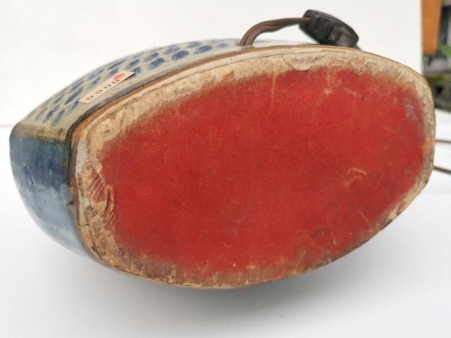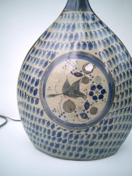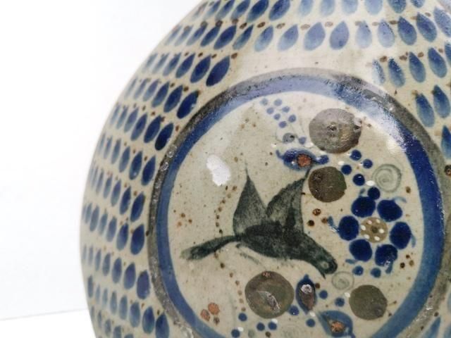 曲線が美しい陶器のボディには、水滴や鱗のような点状のブルーの模様に