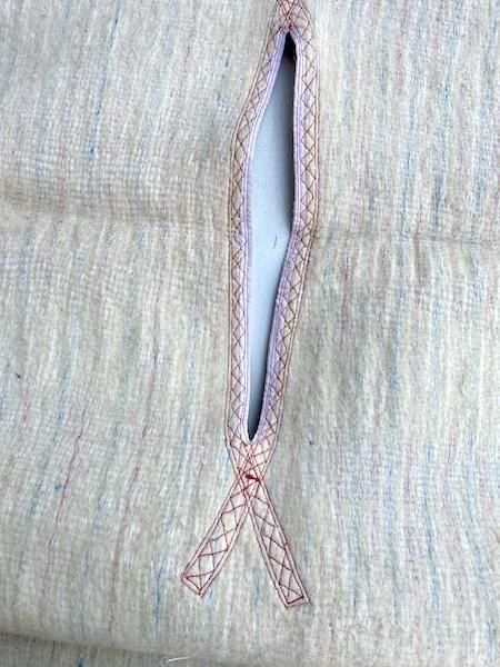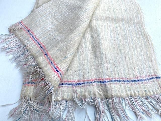 縦に織り込まれたブルーとピンクの糸がオフホワイトに奥行きを加えています。