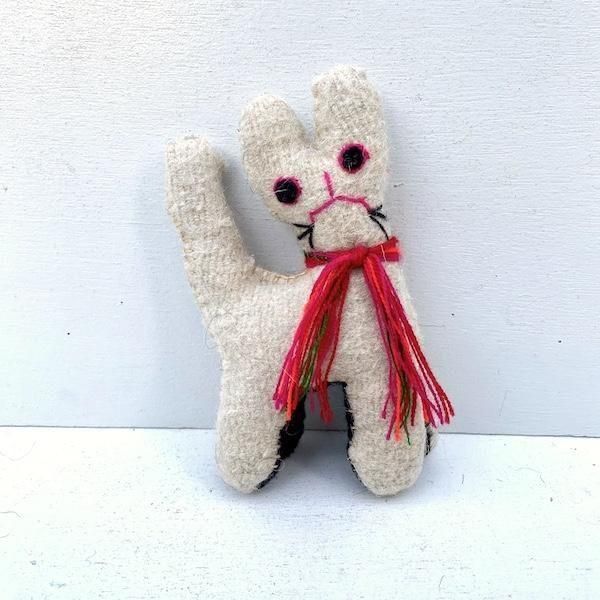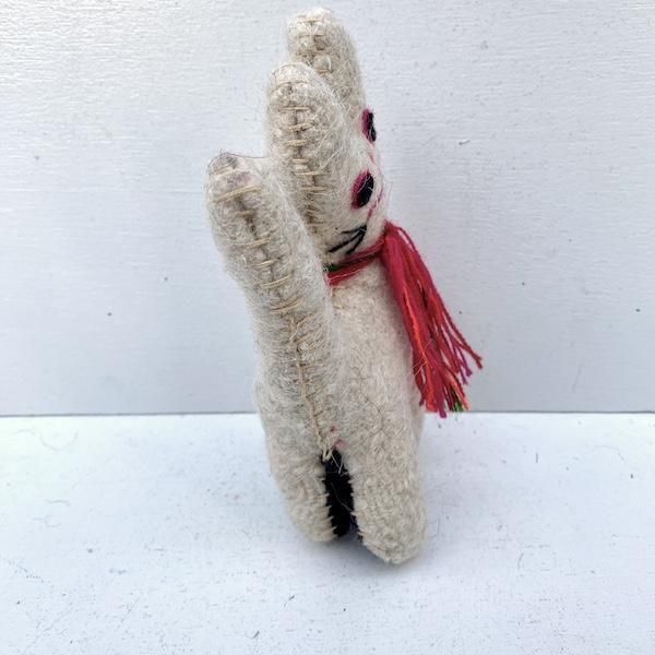 アイボリーのボディに、赤やピンクの暖色系のカラフルな糸の装飾がアクセントに。