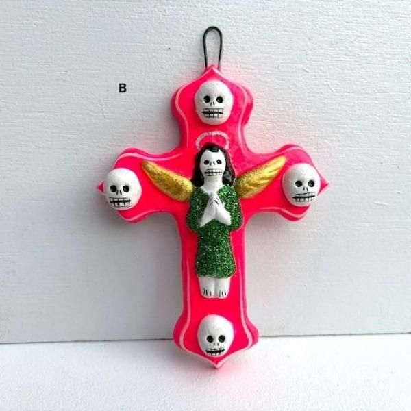 中央には天使の姿をしたガイコツ、十字架の四隅には笑ったようなガイコツの顔がつけられています。