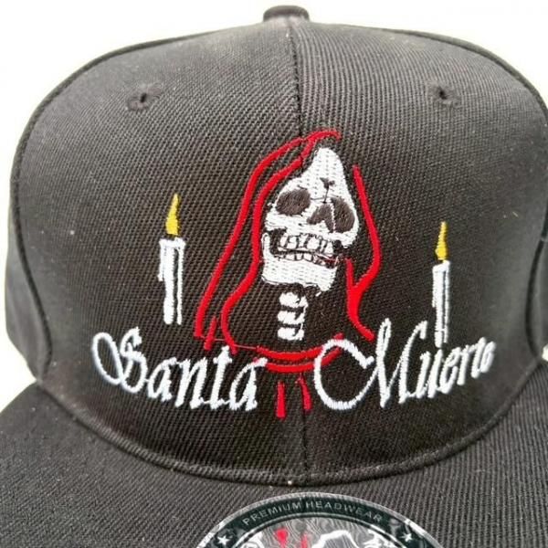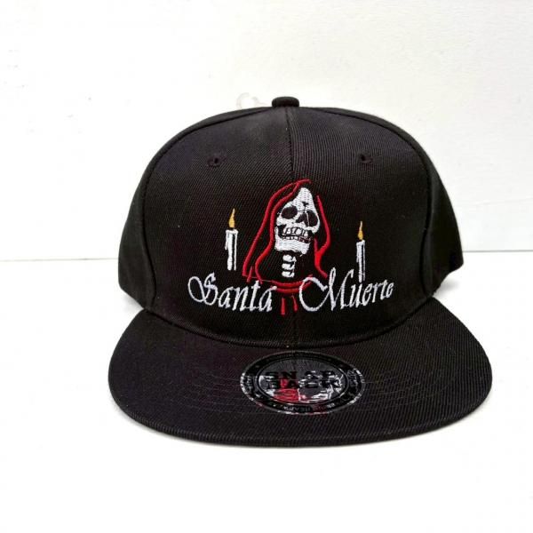 ブラックベースに死神のアイコンとオカルトチックなsanta muerteの文字が刺繍されています。